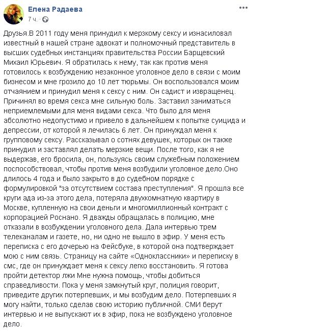 К посту Радаевой прикреплены скриншоты её переписки с дочерью Барщевского. Кандидат юридических наук Наталия Барщевская (если это действительно она) в своих сообщениях не отрицает связь отца с Еленой, просит не делать историю публичной и выражает готовность помочь Радаевой материально, "оплатить всё необходимое для Вашей дочки".