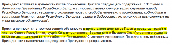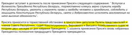 Итак, избрание г-на Лукашенко официально подтверждено ЦИК, на основе чего уже состоялась (в полном соответствии с Законом) официальная инаугурация, и это, что бы ни визжали за кордоном, факт. А что без иностранцев, так они на данном мероприятии предусмотрены чисто, как декорация, без которой можно и обойтись. Как в 2010-м. Соответственно, - поскольку в Конституции