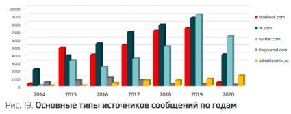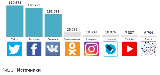 Наиболее динамичный рост из числа онлайн-платформ, на которых распространялись сообщения рассматриваемой категории, показывают «Facebook», «ВКонтакте», «Twitter», «Одноклассники». В «livejournal» наблюдается постепенное падение числа сообщений, что обусловлено снижением популярности платформы.