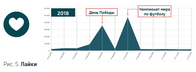Всплеск вовлечённости пользователей в мае 2018 г. (36 тыс. лайков) ожидаемо связан с празднованием Дня Победы. Вместе с тем, рост количества лайков в июле 2018 (почти 48 тыс. лайков) является нехарактерным. Он возник на фоне публикаций о проведении в России Чемпионата мира по футболу. Реакция болельщиков на успехи сборной России также была названа «победобесием».