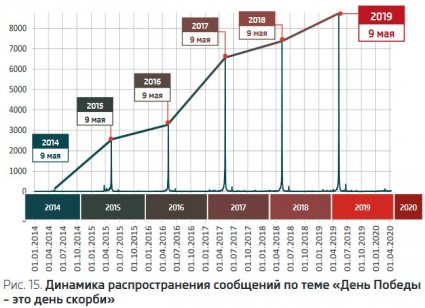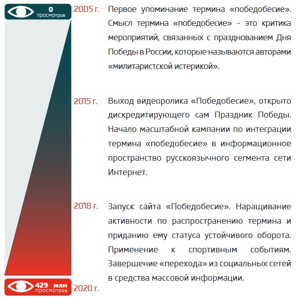 • С 2019 г. по март 2020 г. публикации с использованием термина «победобесие» уже были просмотрены более 122 млн раз, учитывая, что в 2020 г. еще не было ожидаемого пика, связанного с Днем Победы.