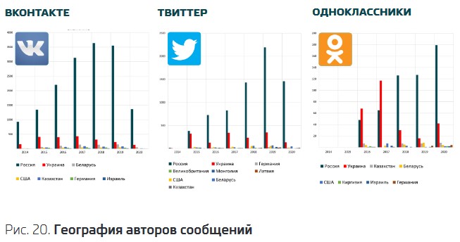 В социальных сетях «ВКонтакте», «Twitter», «Одноклассники» и «livejournal» преобладают российские пользователи, после которых в порядке убывания их количества располагаются авторы из Украины, Беларуси, Казахстана, США, Израиля и Германии.