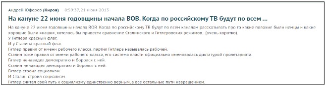 Интересно, что фрагменты данного поста начали распространяться еще в 2013 году. Пользователь социальной сети «ВКонтакте» «Андрей Юферев» (https://vk.com/id117701175) выкладывал на своей странице следующее (https://vk.com/wall117701175_3755):