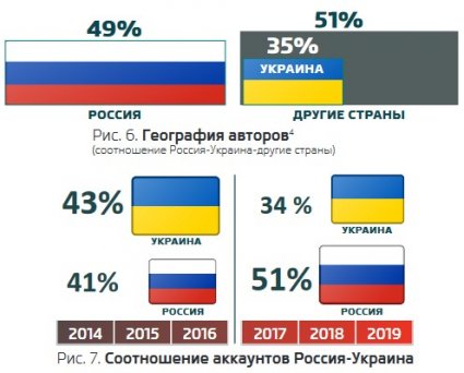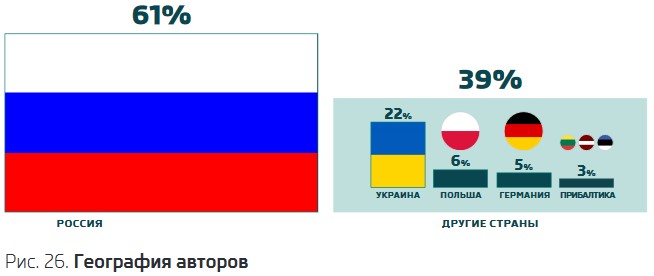 Большая часть иностранных авторов является украинскими (22% от общего числа авторов), активность проявляют также аккаунты из Польши (6%), Германии (5%) и Прибалтики (3%).