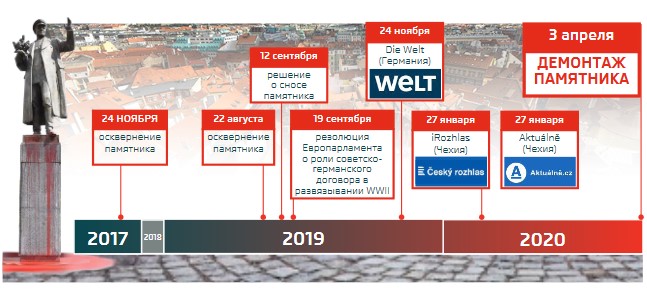 Одним из примеров спланированной информационной кампании является ситуация вокруг памятника маршалу И.С. Коневу в Праге, который был демонтирован 3 апреля 2020 года.
