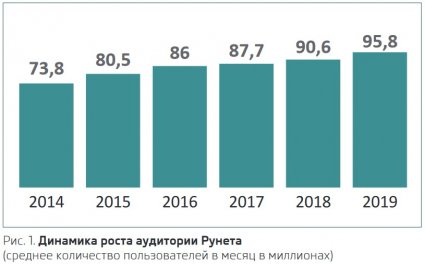 Важно отметить, что в ходе подготовки материалов исследования во внимание приняты и темпы роста пользователей Рунета. Статистика Минкомсвязи выглядит следующим образом: