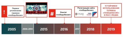2015 - Выход видеоролика «Победобесие», открыто дискредитирующего сам Праздник Победы. Начало масштабной кампании по интеграции термина «победобесие» в информационное пространство русскоязычного сегмента сети Интернет.