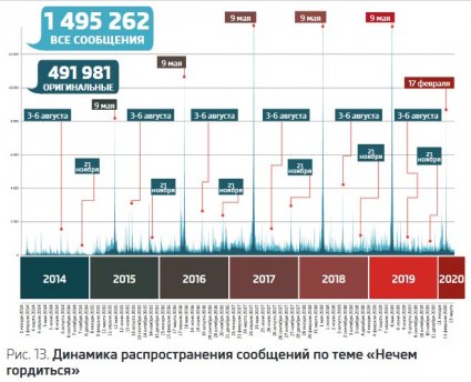 В рамках темы «нечем гордиться» выделяется тезис «День Победы – это не праздник», основу которого составляют публикации о том, что «9 мая – это день скорби». Как и в случае с «победобесием» количество сообщений ежегодно поступательно растет. При этом, если количество сообщений, относящихся ко всей теме «нечем гордиться» в 2018 году естественным образом снизилось из-за роста патриотических настроений в обществе, показатели информационной кампании «День Победы – это не праздник» остались последовательно возрастающими. В данном случае, допустимо говорить об искусственном характере распространения данной категории сообщений.