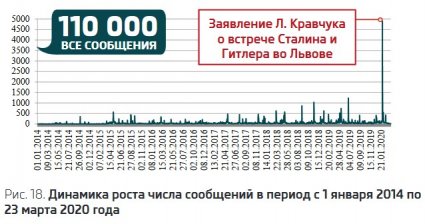 Количество сообщений относительно невысоко, по сравнению с аналогичным показателем других тем. Однако пик сообщений в 2020 году ярко выделяется на общем фоне. Он связан в первую очередь с заявлением экс-президента Украины Л. Кравчука, в котором, помимо прочего, он говорит о встрече И. Сталина и А. Гитлера во Львове. Данный информационный повод имел относительно кратковременный характер, однако заявления известных политиков и общественных деятелей часто используются как основа масштабных информационных кампаний.