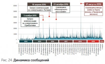 В рамках настоящего исследования выявлено и проанализировано бо-лее 1 миллиона 125 тысяч подобных публикаций. Вместе с этим утверждением распространяются спорные тезисы, альтернативные версии и взгляды на исторические события XX и XXI веков в России. Неотъемлемой их частью становятся попытки внедрения о общественное сознание устойчивых понятий «агрессивная Россия», «агрессивные русские», «оккупация», «аннексия», «преступный режим» уже со ссылкой на современные события.