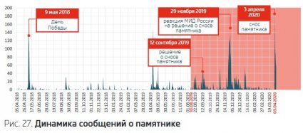 Показатели начала 2020 года уже практически достигли значений 2016-го, несмотря на то, что ожидаемый для тем, связанных с Великой Отечественной войной, пик активности в мае еще не наступил. Основные пики сообщений приходятся на март-август и ноябрь, каждого года и связаны с датами таких событий, как: