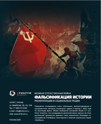 Основной целью исследования является выявление и изучение закономерностей в распространении информации, содержащей признаки фальсификации истории ВОВ. Главными задачами являются: анализ объемов распространения информации по указанным выше темам, анализ авторов сообщений, их географии и связей между ними, исследование используемых ими приемов и тактик. Предмет исследования: публикации** в социальных медиа (интернет-СМИ, социальные сети, блоги, форумы) на русском языке. Количество изученных сообщений составило более 4,7 млн. Количество авторов, опубликовавших сообщения, составило более 1,3 млн. Проведен количественный и качественный анализ материалов, входящих в предмет. Данные, используемые в исследовании, получены с использованием Платформы мониторинга и анализа социальных медиа «Крибрум».