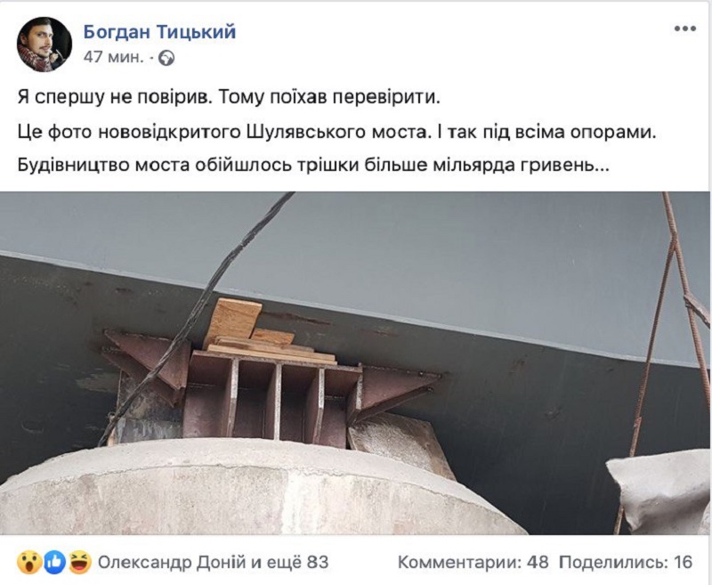 А ведь помните, как строительство этого моста противопоставлялось строительству Крымского моста. Мол, на Украине тоже могут качественно реализовывать инфраструктурные проекты, пусть даже и по ремонту большого моста.