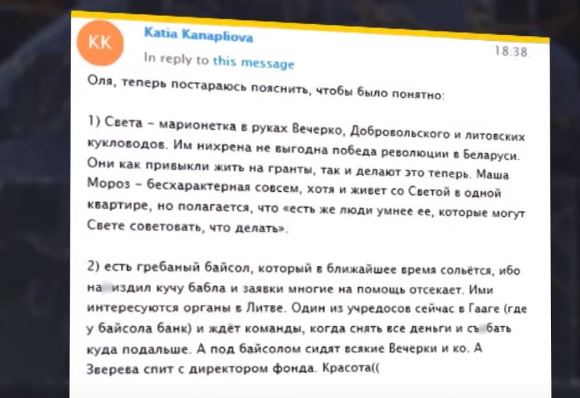 На белорусском канале ОНТ с прошлой недели выходил целый цикл роликов основанный на массиве слитой внутренней переписки и видеозвонков участников белорусской оппозиции, где обсуждались различные внутренние вопросы связанные с денежными вопросами.