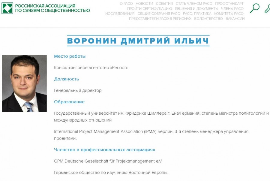 "Дмитрий Ильич Воронин" присутствует на сайте Российской ассоциации по связям с общественностью (РАСО), куда входит немало именитых российских политтехнологов/пиарщиков/джиарщиков. Здесь мы можем узнать про образование Демури (Государственный университет им. Фридриха Шиллера в г. Йена/Германия - степень магистра политологии и международных отношений, International Project Management Association в Берлине - 3-я степень менеджера управления проектами) и его "членство в профессиональных ассоциациях" (GPM Deutsche Gesellschaft für Projektmanagement e.V., Германское общество по изучению Восточной Европы).