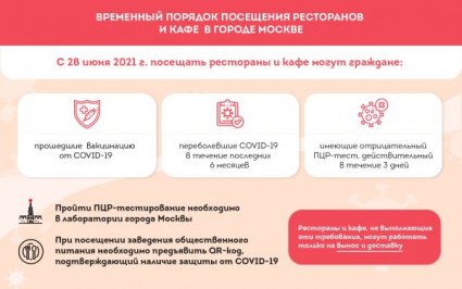 "Понятно, что массовая вакцинация — дело небыстрое. Чтобы она начала давать результат, потребуется ещё два-три месяца. Последние дни мы совместно с представителями общепита провели эксперимент по созданию точек, «свободных от ковида». Сегодня я подписал указ, в соответствии с которым использование этой технологии будет обязательным для всех ресторанов и кафе, которые хотят продолжить работу в обычном режиме. С 28 июня 2021 г. посещать заведения общественного питания смогут только посетители, имеющие защиту от заболевания: прошедшие вакцинацию; переболевшие COVID-19 в течение последних 6 месяцев; либо имеющие отрицательный ПЦР-тест, действительный в течение 3 дней. Пройти ПЦР-тестирование необходимо в одной из лабораторий города Москвы, передающих сведения в систему ЕМИАС. Наличие защиты от коронавируса подтверждается специальным QR-кодом, получить который можно будет с использованием: электронной медицинской карты г. Москвы; портала mos.ru; ресурса ЕМИАС.ИНФО; единого портала государственных и муниципальных услуг или специализированного приложения «Госуслуги.Стопкоронавирус», либо в регистратуре городской поликлиники. Никакие бумажные справки или сертификаты приниматься не будут. Рестораны и кафе обязаны создать систему проверки наличия QR-кодов. Фудкорты будут открыты только после проверки системы контроля, препятствующей проходу в зону посадочных мест посетителей, не имеющих QR-кодов. Предприятия общественного питания, не выполняющие эти требования, смогут работать только на вынос или доставку. Конечно, в процессе адаптации к новому порядку посещения заведений общепита у граждан могут возникать вопросы, связанные с отсутствием в базах данных сведений о вакцинации, перенесённом заболевании или сданном ПЦР-тесте. Для решения этих вопросов создана специальная группа разбора, которая будет работать максимально оперативно. Обратиться в группу разбора можно будет через личный кабинет на портале mos.ru. Аналогичные правила посещения ресторанов и кафе уже несколько месяцев действуют во многих европейских и азиатских городах. И Москве настала пора перенимать их опыт", - объявил Собянин.