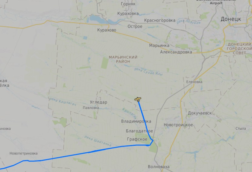 А сайт «Милитарный» проследил его полет в восточном направлении до северных окраин Волновахи. Затем, перед прифронтовым Новотроицком «Байрактар» развернулся на север – до оккупированного Докучаевска оставалось не более пятнадцати км. Смотри скрины.