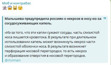 «Из-за того, что эти капли сужают сосуды, часть слизистой носа лишается кровотока. В результате при длительном использовании капель может возникнуть некроз части слизистой оболочки носа. В результате возникнет перфорация носовой перегородки, то есть некроз и образование отверстия в носовой перегородке.
