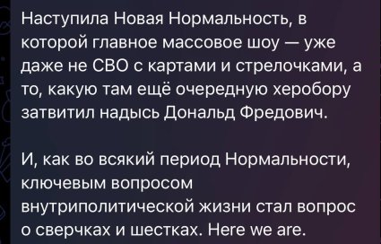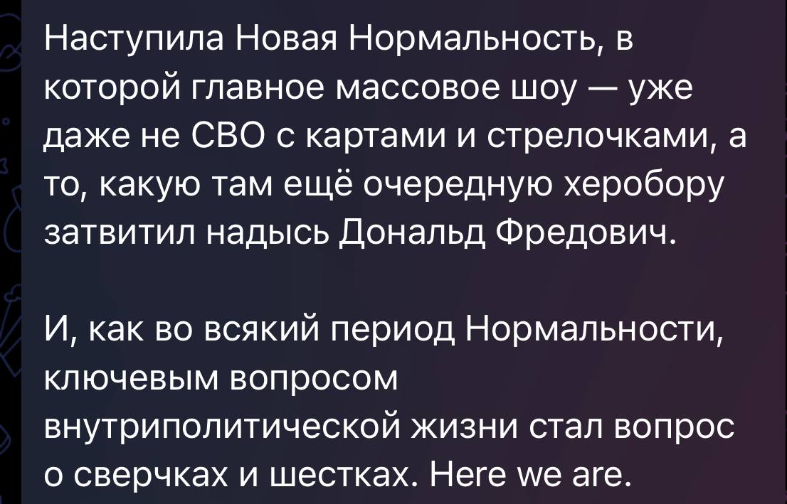 Сверчки и шестки означают следующее. Инструменты, которые ранее применялись в основном в отношении тех, кто по ту сторону, будут всё более массово применяться для разного рода внутренних разборок — и здесь преимущество у тех, кто ближе к админресурсу. Условно, не успел ты — успели тебя. Это не есть хорошо, но это абсолютно неизбежно по логике ситуации. Наша система не может позволить себе слишком большую внутреннюю динамику, чтобы на авансцену в товарных количествах выходили «никто и звать никак» и, словно право имеющие, открывали рот на Уважаемых Людей. Кстати, сами Уважаемые Люди будут молчать, а вот «нижний телеграм» захлебнётся слюной — их час пробил, они свою «войну» считай уже выиграли. Относиться к происходящему можно по-всякому, но вот удивляться точно нечему — «погоды стоят предсказанные».