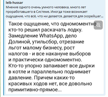 Такое ощущение что одномоментно кто-то решил раскачать лодку. Замедление WhatsApp, дело Долиной, утильсбор, отрезание льгот малому бизнесу, рост налогов - и всё накануне выборов и практически одномоментно. Кто-то упорно запаивает все дырки в котле и параллельно поднимает давление. Причём каких-то красивых ходов нет, всё довольно примитивно-прямое...
