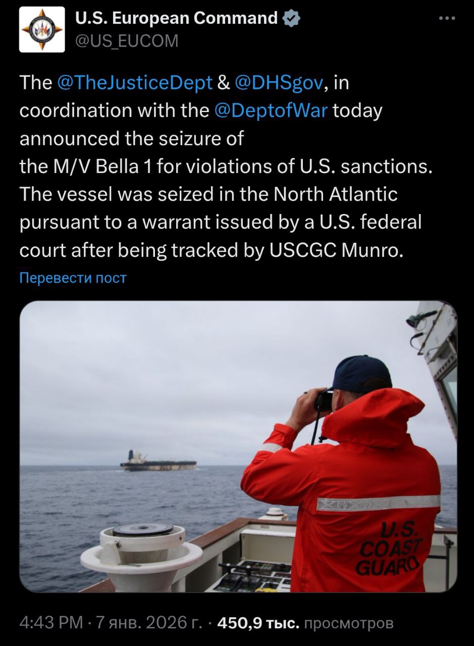 Танкер связан с перевозкой венесуэльской нефти в обход санкций США (часть «теневого флота»).✨ Действия произведены на основании ордера федерального суда США, т.е. носят экстерриториальный статус (когда правовые нормы применяются за пределами территории, на которой они были установлены).