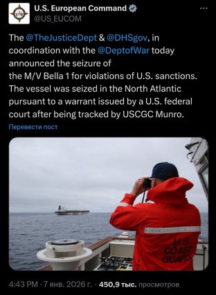 Американское командование в Европе сообщило о задержании танкера Marinera под российским флагом, который раньше назывался Bella 1 и ходил под панамским флагом.
