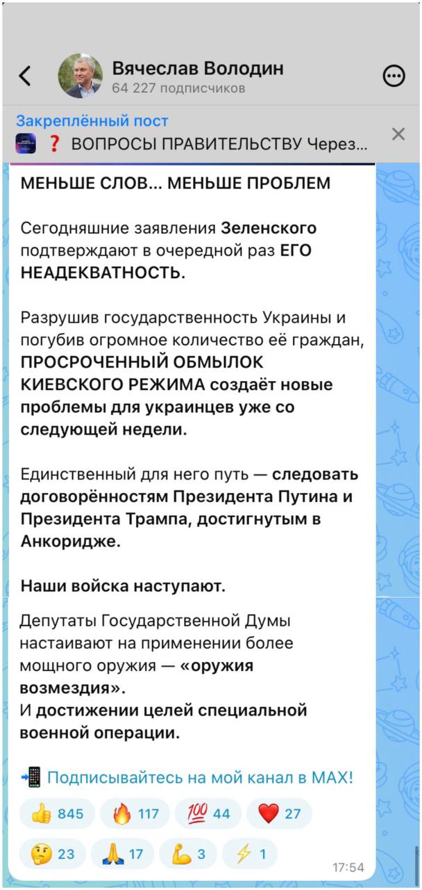 Пост уважаемого спикера Госдумы Вячеслава Володина написан в стиле уважаемого Дмитрия Медведева — жёсткие формулировки, капслок.