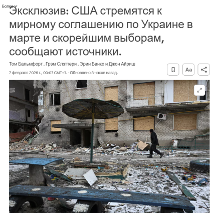 "1. По данным трех источников, знакомых с ситуацией, американские и украинские переговорщики обсудили амбициозную цель – достижение Россией и Украиной соглашения о мирном урегулировании в марте, хотя эти сроки, вероятно, будут сдвинуты из-за отсутствия согласия по ключевому вопросу о территории"