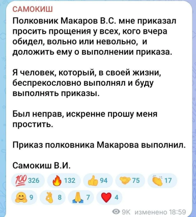 Из-за публичного скандала пишут, что во фракции «Единая Россия» рассматривали вопрос о лишении его мандата. После этого Самокиш публикует извинение и заявляет, что действует «по приказу полковника Макарова» и отчитывается о выполнении приказа.