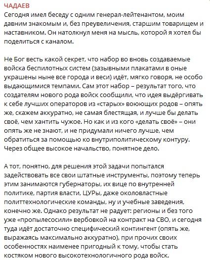 Да кто б спорил насчёт общевойскового подхода. В целом. Но есть нюансы, связанные с фактором времени. Чинить МО и большой ВПК — можем тупо не успеть, особенно если в процессе ремонта дойдёт, к примеру, до переписывания законов, включая 44-й (о госзакупках), 275-й (о гособоронзаказе) и другие столпы нашего орднунга, особенно с учётом того факта, что нынешняя ГД дорабатывает последнюю сессию, а новая только к январю по кабинетам рассядется. А я как-то сомневаюсь, что наш невероятный противник будет вежливо ждать, пока мы все эти обязательные процедуры завершим. Поэтому и говорю, что нужен иной темп, и если структура объективно на него неспособна, значит, нужны другие решения..