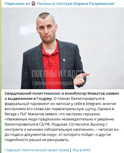 Свердловский политтехнолог и военблогер Маматов заявил о выдвижении в Госдуму. О планах баллотироваться в федеральный парламент он написал у себя в telegram, многие восприняли его слова как первоапрельскую шутку. Однако в беседе с ПиГ Маматов заявил, что настроен серьезно. «Уважаемые люди предложили незамедлительно и уверенно баллотироваться в ГД РФ. Подумал. Согласился. Выхожу с контракта и начинаю избирательную кампанию», – написал он. До подачи документов округ, от которого пойдет, и другие подробности решил не раскрывать.