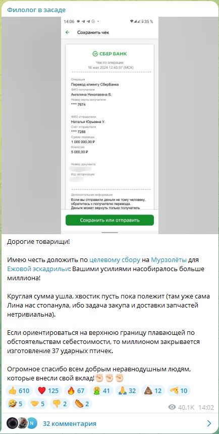 Далее еще придется вспомнить, как ты собрала для нашего 87 полка дронов на один миллион рублей. Точнее — не так. Миллион рублей ты собрала, его тебе Филолог переводил. Сбор у него под меня был. А дроны ты так и не поставила!