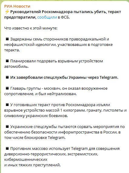 Преступление было. Точнее готовилось. И пресечено на стадии подготовки. Но интересно не только это. Во первых - прямо озвучена претензия к ТГ. Это канал связи террористов. А если упростить - вербовщиков с биодронами. И это чистейшая правда. Павел Дуров принципиально не сдает клиентов. Такие вот у него убеждения. Хотя все сильно глубже, на самом то деле. Как и атаки дронов это не наведение крыльев. Это ФПВ. В глубоком тылу.
